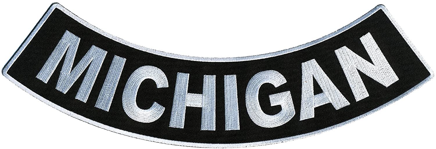 Original Famous Patches & Appliques, MICHIGAN BOTTOM ROCKER Embroidered Sew-on Patches have Unique and Novelty Designs that are Best Addition to your Collection. Decorate your Clothes with this High Thread Patch. Perfect for Leather Jackets and Leather Vests. Great for Jeans, Blouses, Bags or any Clothing. Wear this Heat Sealed Backing Patch is Made from Premium Quality Fabric and Sturdy Adhesive Materials. A Merchandise Designed and Manufactured in the USA. Size - 12” x 3”.