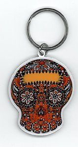 Maryann Luera, A keychain, or keyring, is a small chain, usually made from metal or plastic, that connects a small item to a keyring. The length of a keychain allows an item to be used more easily than if connected directly to a keyring. Some keychains allow one or both ends the ability to rotate, keeping the keychain from becoming twisted, while the item is being used. Filigreed orange Sugar Skull, in a fab metal keyring. Artist: MaryAnn Luera
