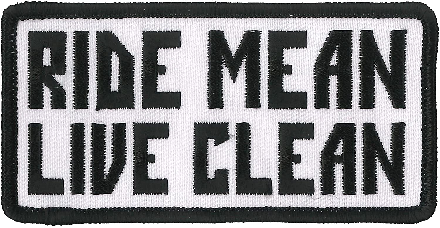 Original Famous Patches & Appliques, RIDE MEAN LIVE CLEAN Embroidered Sew-on Patches have Unique and Novelty Designs that are Best Addition to your Collection. Decorate your Clothes with this High Thread Patch. Perfect for Leather Jackets and Leather Vests. Great for Jeans, Blouses, Bags or any Clothing. Wear this Heat Sealed Backing Patch is Made from Premium Quality Fabric and Sturdy Adhesive Materials. A Merchandise Designed and Manufactured in the USA. Size - 4" x 2".