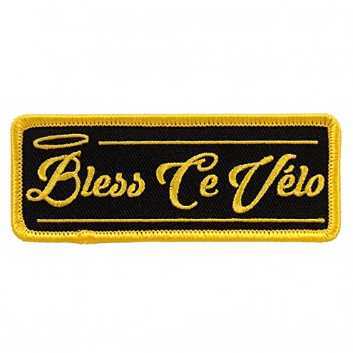 BLESS CE VELO BLESS THIS BIKE, High Thread Embroidered Iron-On / Saw-On, Heat Sealed Backing Rayon PATCH - 4" x 1"