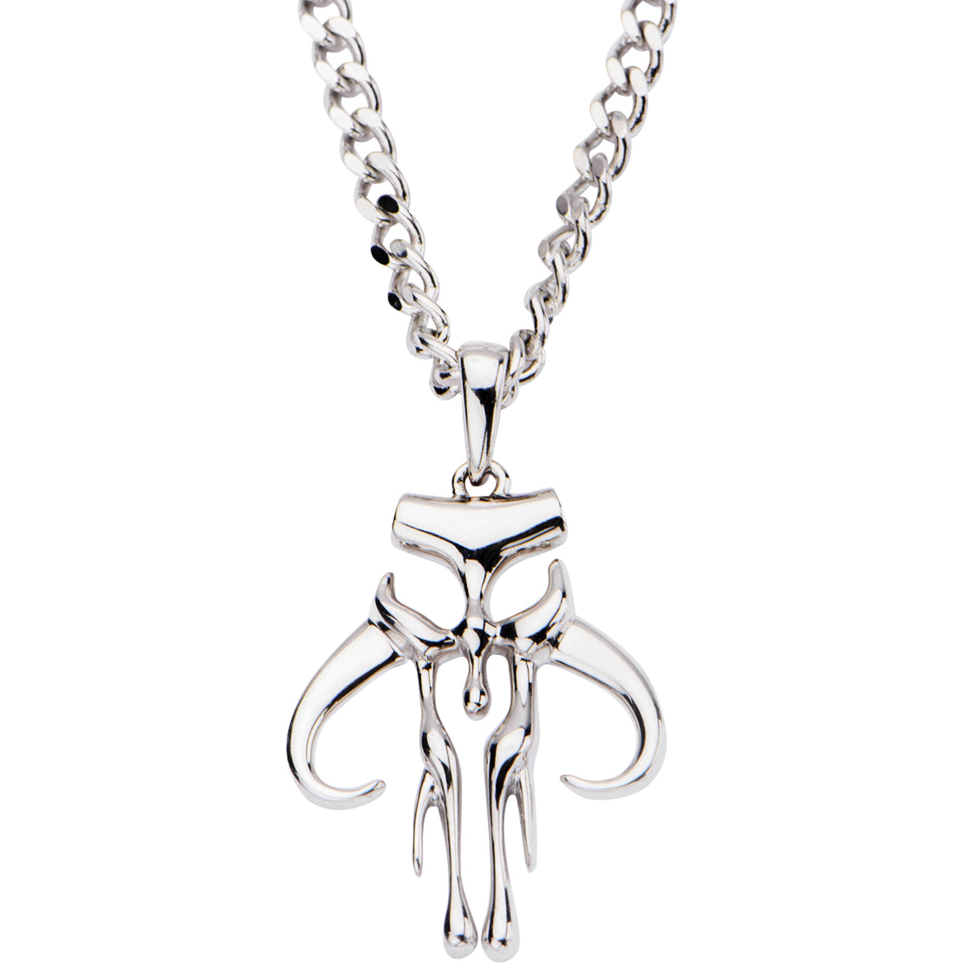 Men's 925 Sterling Silver Star Wars Mandalorian Cut Out Pendant with Chain. Licensed Jewelry Packaging Included. Pendant Dimension: 1.5" (Length) x 0.75" (Width) x .098" (Height). Chain Size: 24 inch long.