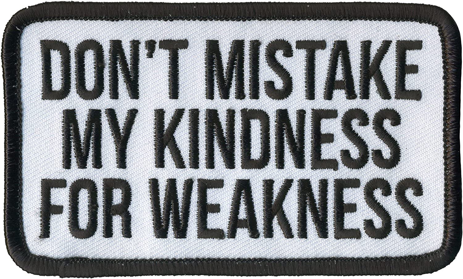 Original Famous Patches & Appliques, DON'T MISTAKE MY KINDNESS FOR WEAKNESS Patch have Unique and Novelty Designs that are Best Addition to your Collection. Decorate your Clothes with this High Thread Embroidered Sew On Patch. Perfect for Leather Jackets and Leather Vests. Great for Jeans, Blouses, Bags or any Clothing. Wear this Heat Sealed Backing Patch is Made from Premium Quality Fabric and Sturdy Adhesive Materials. A Merchandise Designed and Manufactured in the USA. Size - 4" x 2.5".