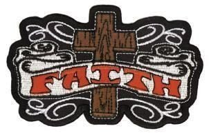 Tattoo inspired wooden cross design with the word Faith. 3.75"x2.5" embroidered patch. Artist: Enginehouse13