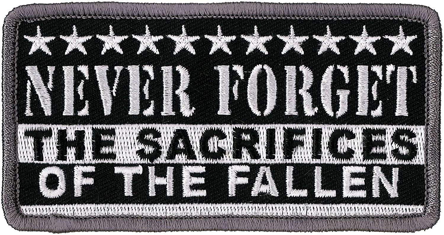 Original Famous Patches & Appliques, NEVER FORGET THE SACRIFICES OF THE FALLEN Embroidered Sew-on Patches have Unique and Novelty Designs that are Best Addition to your Collection. Decorate your Clothes with this High Thread Patch. Perfect for Leather Jackets and Leather Vests. Great for Jeans, Blouses, Bags or any Clothing. Wear this Heat Sealed Backing Patch is Made from Premium Quality Fabric and Sturdy Adhesive Materials. A Merchandise Designed and Manufactured in the USA. Size - 4" x 2".