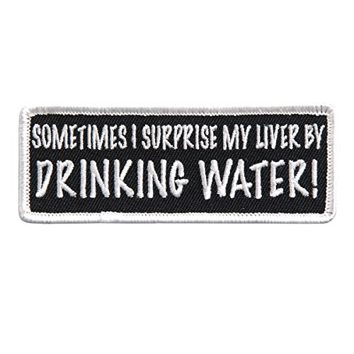 Sometimes I Surprise My Liver By Drinking Water! embroidered in white lettering on a black background with white trim and heat sealed backing for easy iron-on application. All patches are designed in the USA and feature original Officially Licensed artwork you will not find anywhere else. High thread count embroidery contributes to high quality and long lasting durability of our superior patches! Unmatched when it comes to bright colors and intricate, incredible designs, our patches are created for easy sewing onto your favorite jacket or vest. Customize your Officially Licensed gear with one of our embroidered patches. We guarantee youÆll find a favorite amongst our many designs!Embroidered Patch Instructions